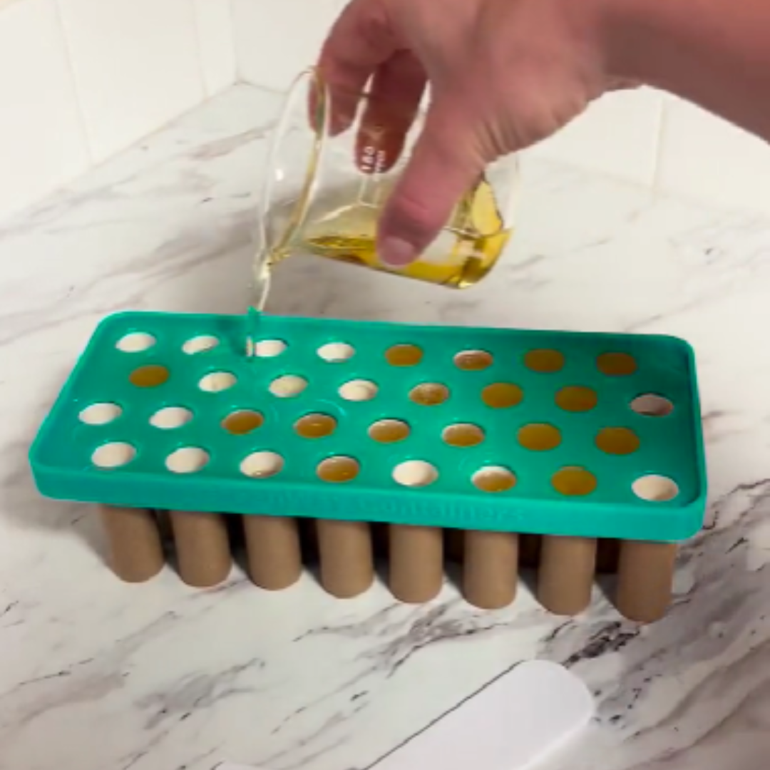 To use the filling tray, simply place your empty paperboard push-up tubes securely into each slot, ensuring they are snugly fitted. Once your balm or mixture is fully melted and ready to pour, carefully fill the tray so the mixture flows evenly into each tube. Use the included scraper to level the surface, allowing for a smooth and even fill across all tubes. After pouring, allow the mixture to fully cool and solidify before gently removing the tubes from the tray. When finished, clean the tray in the dishwasher or by hand for reuse.