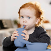 Learning to drink from a straw is an important developmental milestone that develops lip rounding and promotes speech development. The Happy Cup + Straw teaches older toddlers and preschoolers to safely drink from an open cup and straw independently.