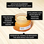 Inspiring, upcycling, uplifting: This night cream is made with the anti-oxidant rich extract of repurposed blueberries, a by-product of the juicing industry.