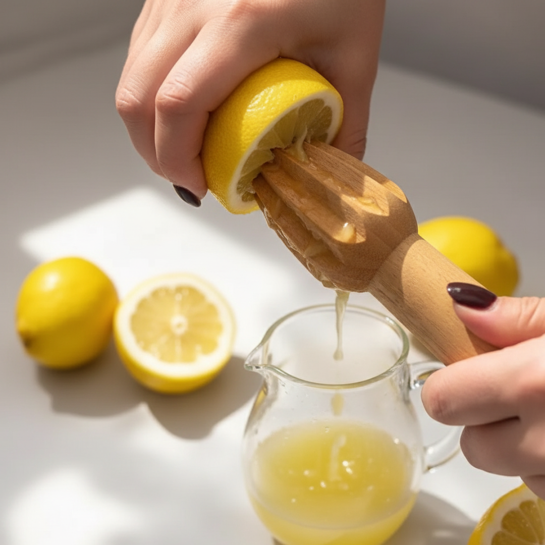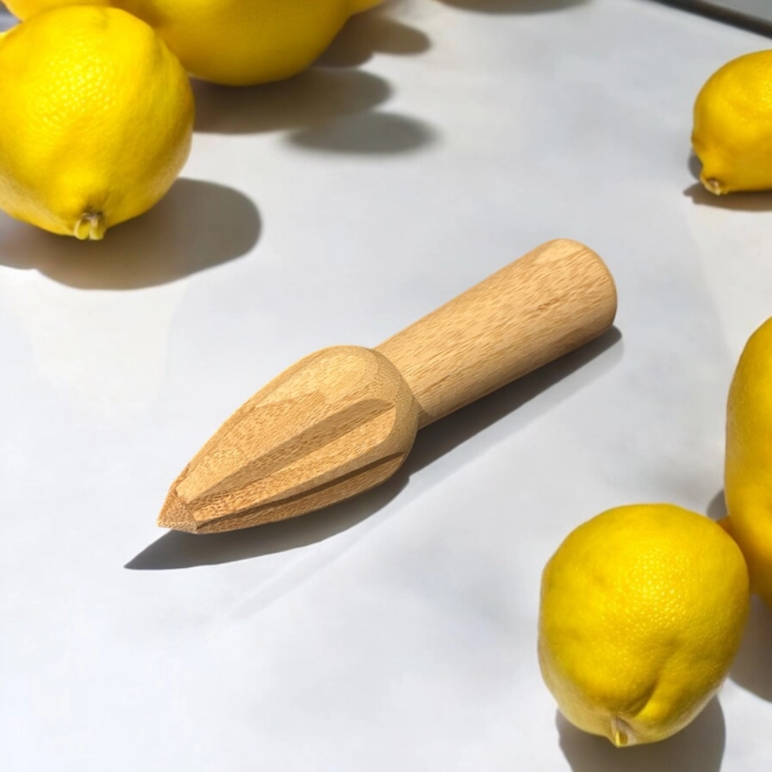 Cut your lemon or lime in half. Hold the Bamboo Lemon Drill by the thicker end and insert the pointed tip into the cut side of the fruit. Twist gently while pressing to extract fresh juice directly into your bowl, cup, or dish. When finished, rinse promptly with warm soapy water and dry immediately to keep the bamboo smooth and long-lasting.