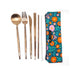 Includes a rose gold stainless steel fork, spoon, knife, chopsticks, straw, and straw cleaner, all tucked neatly inside a handmade organic cotton pouch.