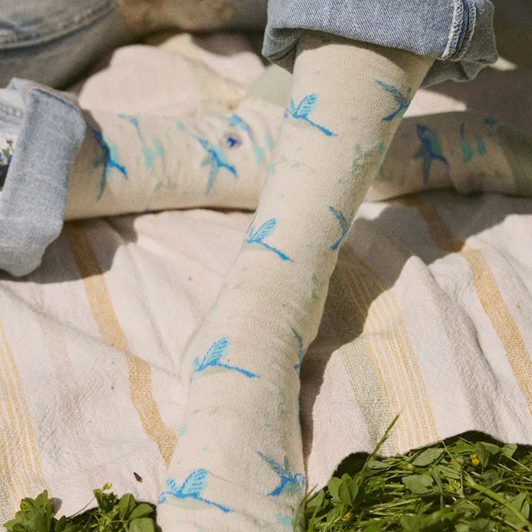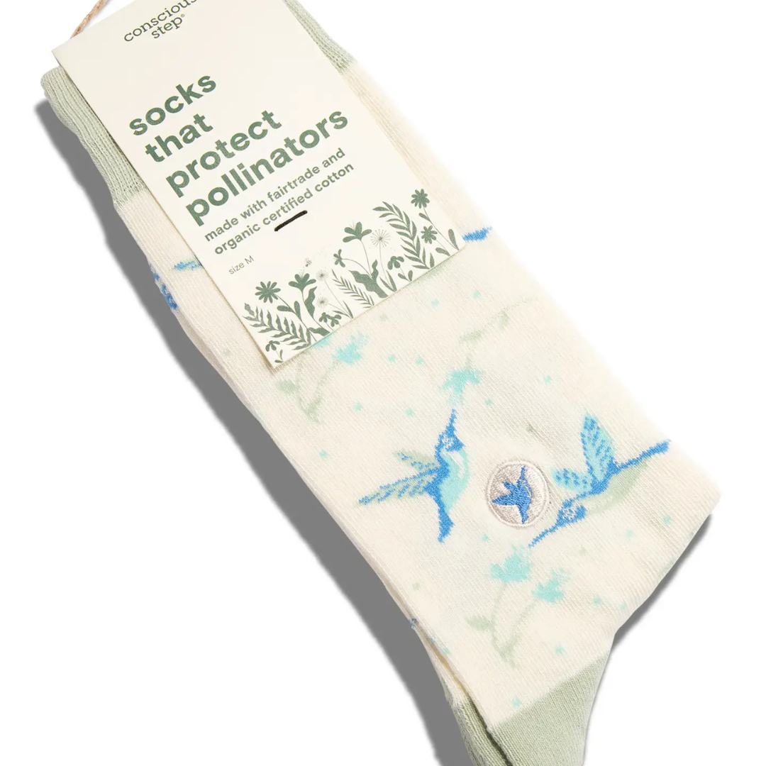 These hummingbird socks are designed to bring color to your wardrobe while supporting the planet. Made with GOTS certified organic cotton, Fairtrade certified production, and vegan-friendly materials, they reduce environmental impact and support ethical working conditions. Each purchase helps fund the Pollinator Partnership, a non-profit dedicated to protecting hummingbirds, bees, and other pollinators crucial to global food security and biodiversity.