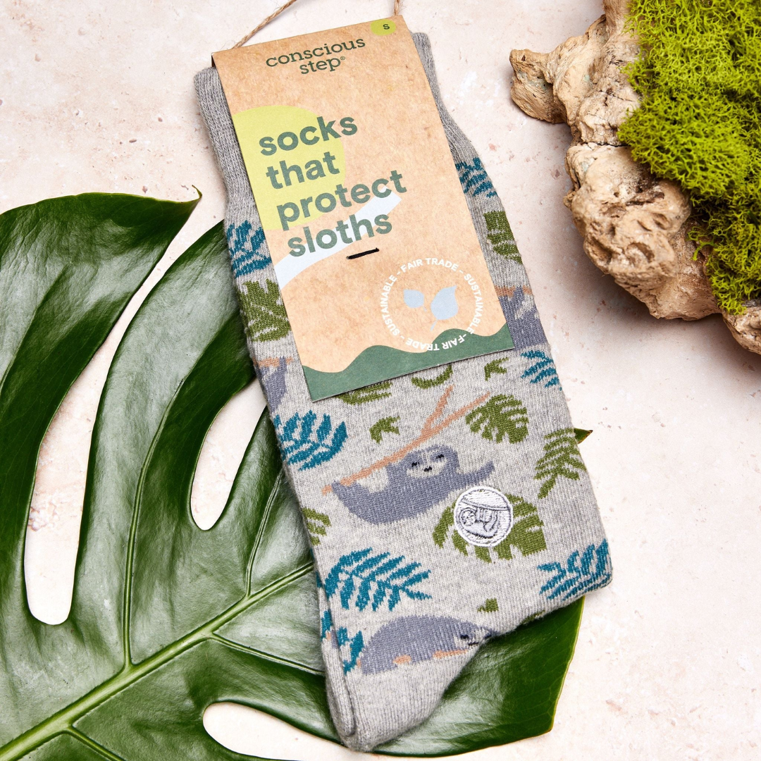 These sloth socks are made with GOTS certified organic cotton, Fairtrade certified production, and vegan-friendly materials to protect the planet and its creatures. A portion of proceeds supports Conservation International, an organization dedicated to protecting endangered wildlife and their habitats. By choosing these socks, you help safeguard biodiversity, reduce chemical pollution, and support fair wages for workers, all while keeping your feet cozy.